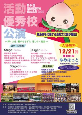 令和7年度の活動優秀校公演は、12月21日(日)に南相馬市民文化会館ゆめはっとで開催します。福島県を代表する高校文化部の生徒たちが一堂に会し、多彩な発表を一日限定で披露する貴重な機会です。どなたでも見たい発表を好きな時間に自由にご覧いただけますので、ぜひお越しください。
